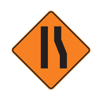 Le panneau «Chaussée rétrécie» (T-D-210-2-D) indique qu’il y a réduction de la largeur de la chaussée mais qu’il n’y a pas de réduction du nombre de voies de circulation. Le panneau T-D-210-2-D indique un rétrécissement par la droite.
