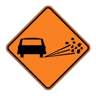 Le panneau « Projection de matériaux » (T-190) indique que des granulats ou du liant d’accrochage peuvent être projetés par les véhicules circulant sur une section de chemin public sur laquelle des travaux sont en cours.