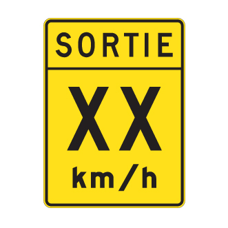 Le panneau « Vitesse recommandée dans une voie de sortie » (D-120) indique la vitesse recommandée dans les voies de sortie d’une autoroute. Ce panneau doit être installé au point de divergence de la voie de sortie.